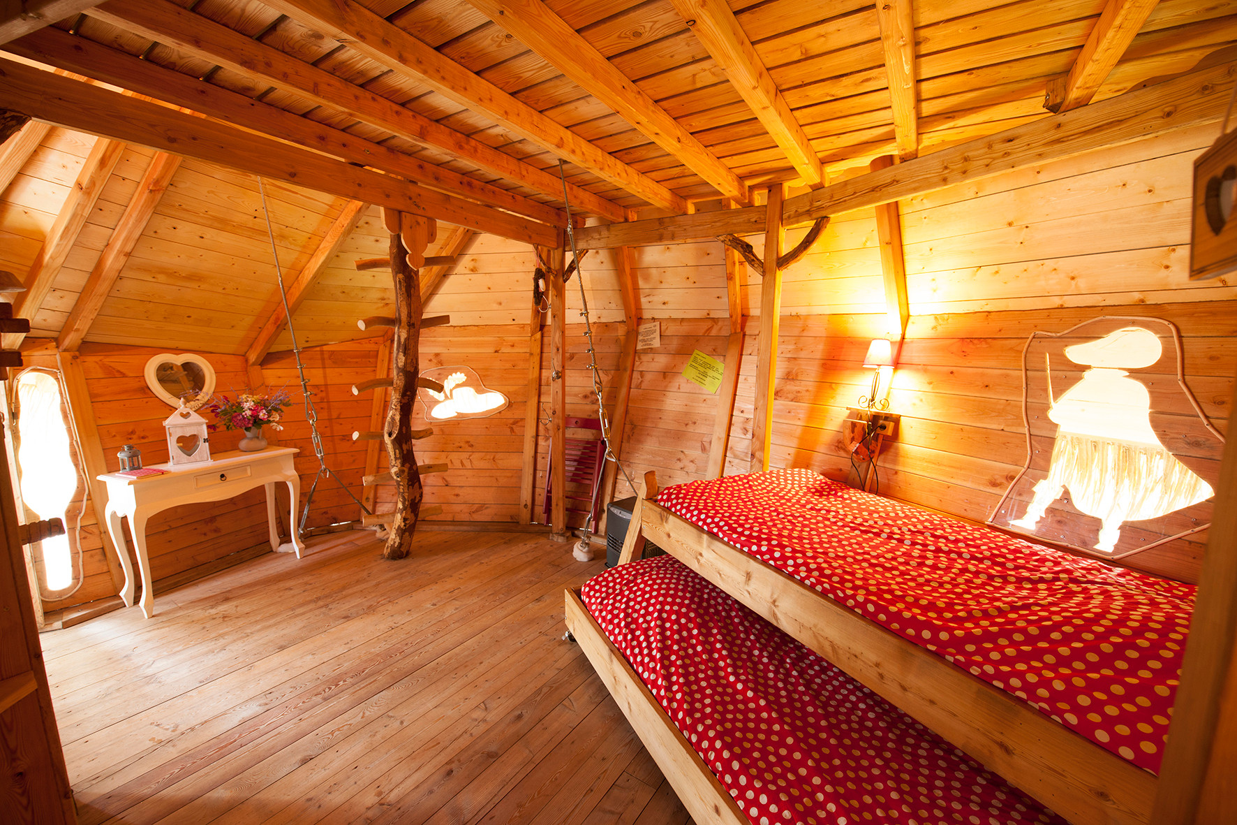 Nous vous proposons de vivre une expérience exceptionnelle et insolite : suspendus entre ciel et terre, vous vous endormirez bercés par le mouvement des branches. Si par hasard, vous souhaitez rester blottis dans votre arbre, nous proposons la formule "panier gourmand" à 2 ou en famille. A votre réveil, le panier du petit déjeuner vous attend au pied de votre arbre. Pour profiter de votre petit-déjeuner sur votre terrasse, tirez sur la corde et le panier apparaîtra. Vous pourrez alors déjeuner tout en admirant le ballet matinal des animaux de la ferme et des oiseaux.